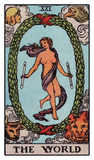 The World tarot card represents completion, wholeness, and fulfillment. It symbolizes the end of a cycle and the achievement of personal and spiritual goals.
